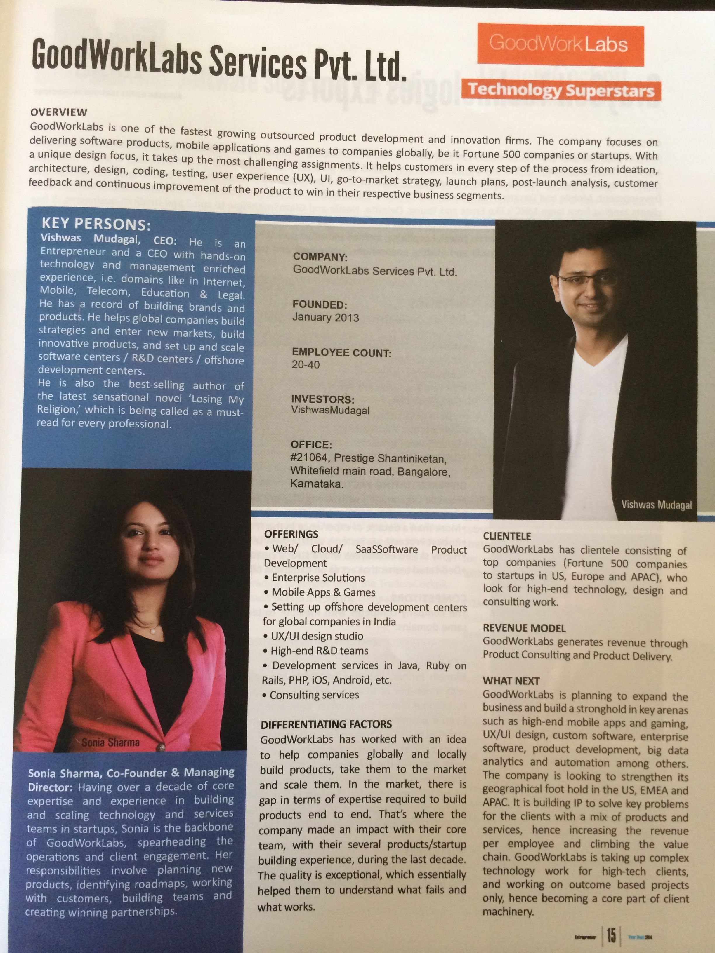 GoodWorkLabs featured in Silicon India Entrepreneur Year Book 2014